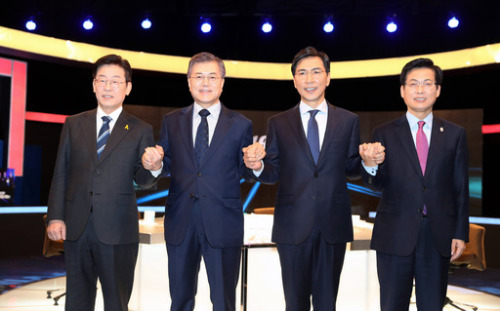 웃고는 있지만… 입력 : 2017-03-21 18:42:29 수정 : 2017-03-21 18:42:29 구글 네이버 유튜브 더불어민주당 대선 경선후보들이 21일 서울 상암동 MBC 스튜디오에서 열린 합동토론회에 앞서 손을 맞잡고 사진촬영을 하고 있다. 왼쪽부터 이재명, 문재인, 안희정, 최성 후보. 국회사진기자단 Copyright ⓒ 세계일보. 무단 전재 및 재배포 금지 세계일보 남상훈