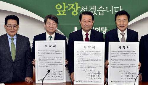 국민의당 공명선거 선포식 입력 : 2017-03-22 18:12:42 수정 : 2017-03-22 18:12:42 구글 네이버 유튜브 국민의당 박지원 대표와 안철수, 박주선, 손학규 경선 후보(왼쪽부터)가 22일 오전 국회에서 열린 19대 대선 후보자 국민경선 공명선거 선포식에서 서약서를 들어 보이고 있다. 이재문 기자 Copyright ⓒ 세계일보. 무단 전재 및 재배포 금지 세계일보 김달중