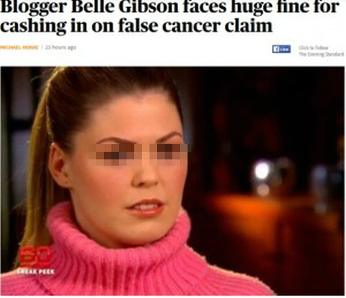 | 소셜미디어(SNS)에서 암을 극복했다는 거짓말로 누리꾼들은 기만하고 책을 내 돈벌이에까지 이용했다가 호주 법원으로부터 유죄 판결을 받은 여성 블로거 벨 깁슨. |