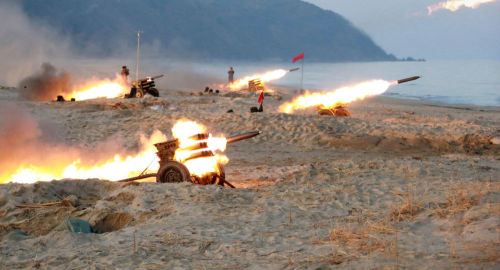| 원산 일대 해안에서 실시된 북한 방사포 부대의 사격훈련에서 107mm 방사포가 로켓탄을 발사하고 있다. 노동신문 |