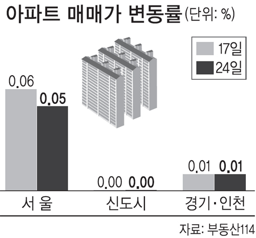 신도시는 분당(0.03%)과 평촌(0.02%)이 올랐고 동탄(-0.05%)은 떨어졌다. 경기·인천은 중소형 아파트를 찾는 실수요가 이어지며 구리(0.05%) 고양(0.03%) 안산(0.03%) 광명(0.02%) 시흥(0.02%) 순으로 아파트값이 올랐다.