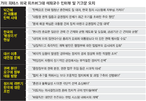 이번 사태와 관련해 우선적으로 말하고 싶은 것은 탄핵으로 인해 엄청난 혼란이 발생했음에도, 그 혼란에 잘 대처했다는 것과 대통령 탄핵에 따른 차기 대통령 선출로 이어지는 헌법을 적용했다는 점에서 한국의 정치시스템에 어느 정도의 자부심을 가져야 한다는 것이다. 이런 식으로 다른 모든 나라가 잘할 수 있었을 것이라 말할 수는 없다. 특히 민주주의 역사가 비교적 짧은 곳에서는 더더욱 어려웠을 것이다. 그렇기 때문에 지난 몇 달 동안의 일들은 대한민국 국민에게는 힘들었겠지만 그 속에서 희망 또한 찾을 수 있을 것이라 생각한다.