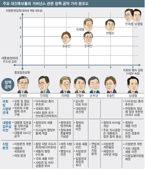 대선후보들은 지역 분권 확대를 일제히 강조하고 있다. 문 후보는 “기존 지방자치에 재정분권까지 더해 연방제에 버금가는 지방분권 공화국을 만들겠다”며 지방분권 개헌 의사를 밝혔다. 안희정 후보는 세종시의 정치·행정수도화를 주장한다. 청와대는 물론 국회와 대법원, 대검찰청을 세종시로 완전 이전하겠다는 복안이다. 이 후보는 TV토론에서 “중앙에 집중된 재원을 지방에 분산하는 분권화, 균형발전 정책을 강화할 것”이라고 말했다.