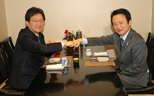 | 바른정당 대통령선거 후보인 유승민 후보(왼쪽)가 31일 서울 여의도 한 일식집에서 당내 경선에서 맞붙었던 남경필 경기도지사와 오찬에 앞서 인사하고 있다. 연합 |