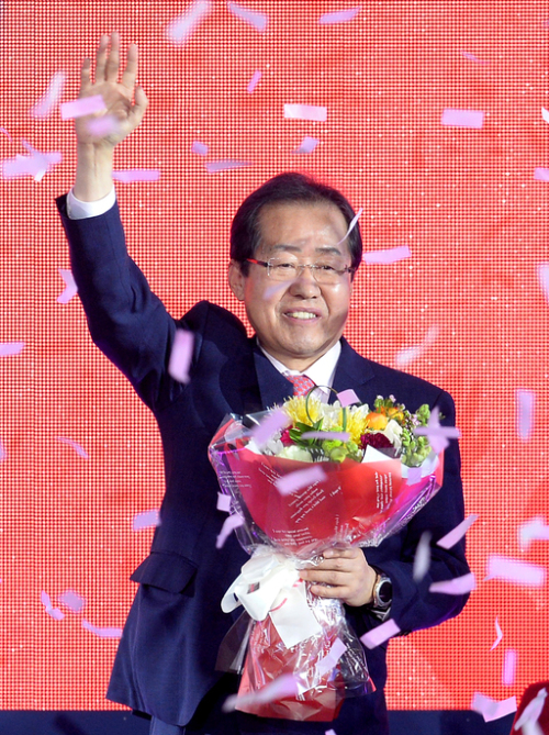 한국당은 이날 서울 장충체육관에서 전당대회를 열어 책임당원 현장투표(50%)와 일반국민 여론조사(50%)에서 1위에 오른 홍 지사를 대선후보로 공식 지명했다.