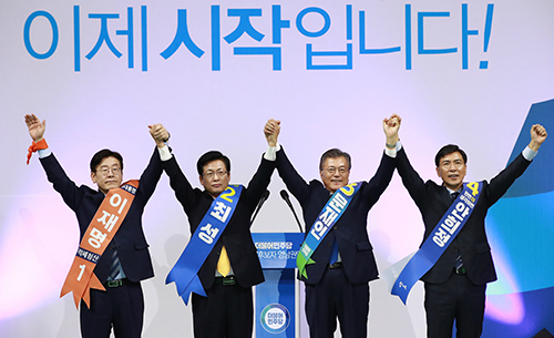 | 31일 오후 부산 사직실내체육관에서 열린 더불어민주당 제19대 대통령후보자 영남권역 선출대회에서 이재명 성남시장(왼쪽부터), 최성 고양시장, 문재인 전 대표, 안희정 충남지사가 지지자들을 향해 손을 들어 인사하고 있다. 연합 |