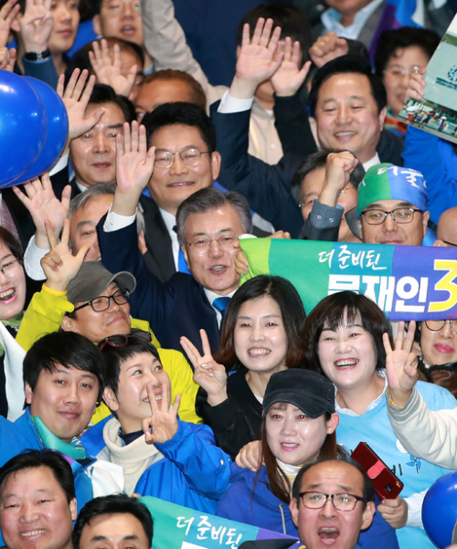 31일 더불어민주당 대통령 후보 영남권 선출대회에서 문재인 경선후보의 현장투표, ARS, 대의원 득표율이 차례로 발표될 때마다 부산 사직실내체육관은 파란색 물결로 요동쳤다. 호남, 충청에 이어 영남까지 연이은 승리에 문 후보 지지자들 어깨가 절로 들썩였다. 영남권 3위로 밀린 안희정 후보는 지지자들을 다독였고, 2위로 올라서며 상승세를 확인한 이재명 후보는 지지자들과 환호를 나누며 수도권에서의 대역전극을 다짐했다.