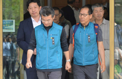 | 변성호 위원장(왼쪽)을 비롯한 전교조 전 지도부가 2015년 5월 28일 해직 교사의 조합원 자격을 제한한 교원노조법 규정이 합헌이라는 결정이 내려진 뒤 굳은 표정으로 서울 종로구 헌법재판소 재판정을 나서고 있다. 남제현 기자 |