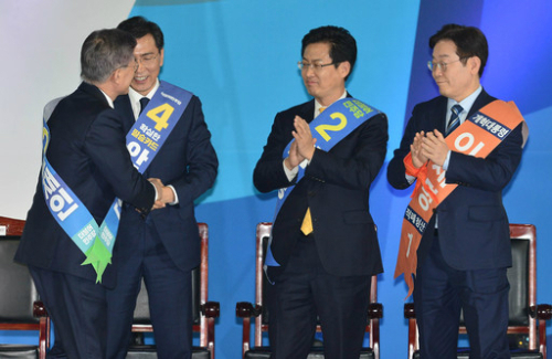 | 더불어민주당 문재인 후보(왼쪽)가 3일 서울 고척스카이돔에서 열린 수도권·강원·제주 선출대회에서 대선후보로 선출된 직후 다른 후보들과 인사하고 있다. 왼쪽부터 문 후보, 안희정 후보, 최성 후보, 이재명 후보. 이재문 기자 |