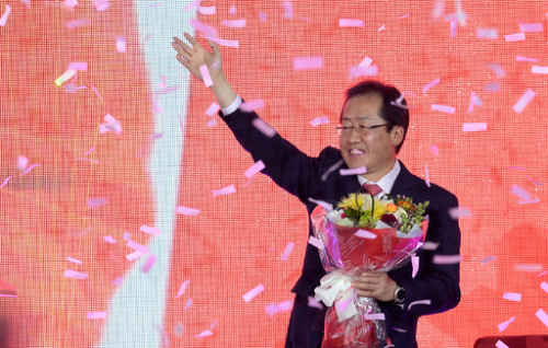 | 홍준표 후보가 지난 3월 31일 서울 중구 장충체육관에서 열린 자유한국당 대통령 후보 선출 전당대회에서 54.2%의 득표율로 대선후보에 선출된 후 손을 들어 지지자들의 환호에 답하고 있다. 세계일보 자료사진 |