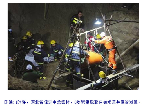 | 지난해 11월에도 중국 허베이(河北) 성 바오딩(保定) 시의 여섯 살 소년이 아버지와 양배추를 따다 근처 깊이 80m 우물에 빠져 숨진 사고가 있었다. 100시간이 넘는 구조 작업 끝에 대원들이 소년을 발견했으나, 이미 숨진 뒤였다. 중국 신화통신 캡처. |