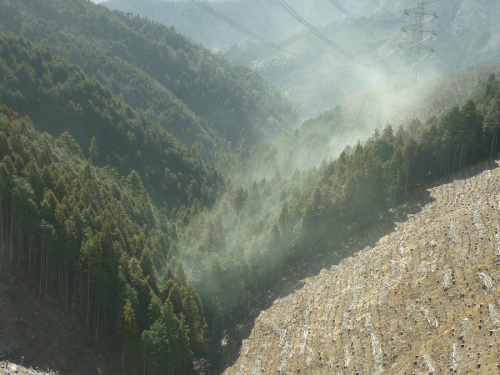 | 일본의 삼나무 숲에서 꽃가루가 흩날리고 있다. 마치 연막탄을 터뜨린 듯하다. |