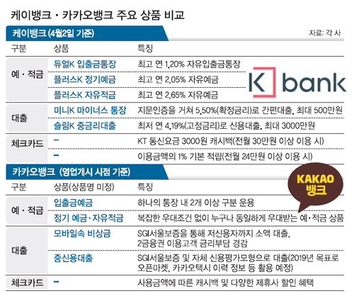케이뱅크와 카카오뱅크는 금융상품 경쟁보다 주주사를 활용한 서비스 경쟁에 나설 전망이다. 금융상품은 모방이 쉽고 지나친 금리경쟁이 발생하면 출혈도 크다. 우선 카카오뱅크는 가입자만 4200만명에 육박하는 메신저 카카오톡을 앞세워 케이뱅크와 차별화한다는 전략이다. 카카오톡 주소록을 이용해 친구에게 메시지를 보내듯 돈을 송금하고 카카오톡을 통한 고객상담도 진행할 예정이다. 카카오택시나 (카카오톡의) 선물하기 데이터를 갖고 신용평가에도 활용할 계획이다. 카카오뱅크 관계자는 “케이뱅크가 (주주사인 KT 영향으로) 통신기반이라면 카카오뱅크는 카카오톡 채널 기반이다”며 “카카오톡을 활용한 서비스를 치열하게 고민하고 있고 적극 활용할 계획”이라고 말했다.