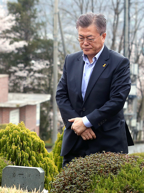 | 더불어민주당 문재인 대선후보가 부인 김정숙 씨와 함께 5일 오후 경남 양산시 상북면에 위치한 부친 묘소를 참배하고 있다. 연합 |