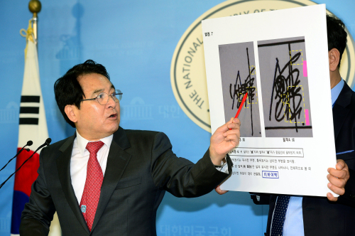 | 자유한국당 심재철 국회 부의장이 5일 서울 여의도 국회 정론관에서 문재인 더불어민주당 후보의 아들 문준용씨의 응시원서와 이력서 위변조 의혹 관련 기자회견을 하고 있다. 남정탁 기자 |