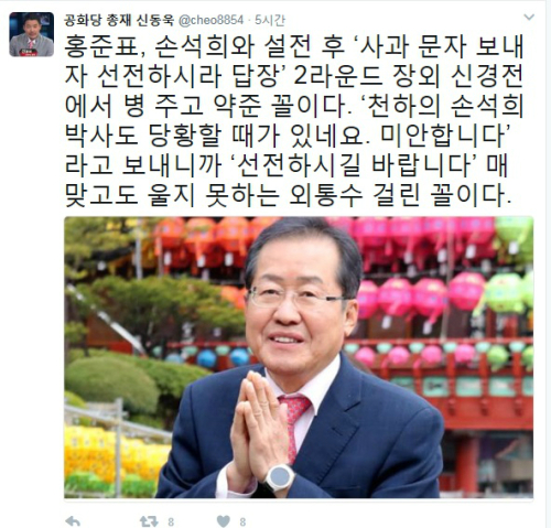 신 총재는 지난 5일 자신의 SNS 트위터를 통해 “홍준표, 손석희와 설전 후 ‘사과 문자 보내자 선전하시라 답장’ 2라운드 장외 신경전에서 병 주고 약준 꼴이다”라며 “‘천하의 손석희 박사도 당황할 때가 있네요. 미안합니다.’ 라고 보내니까 ‘선전하시길 바랍니다.’ 매 맞고도 울지 못하는 외통수 걸린 꼴이다”라고 말했다.