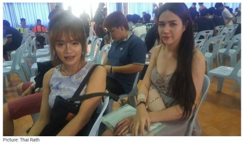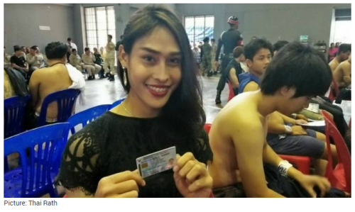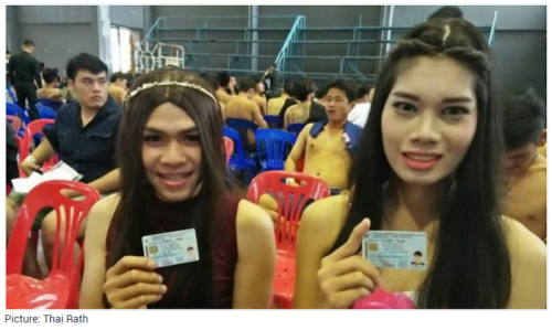 | 매년 4월 입대자를 추첨하는 태국에서 성전환 여성뿐만 아니라 수술을 앞둔 여성적인 게이들이 남성들과 함께 줄 서는 진풍경이 펼쳐진다. 태국 thaivisa 홈페이지 캡처. |