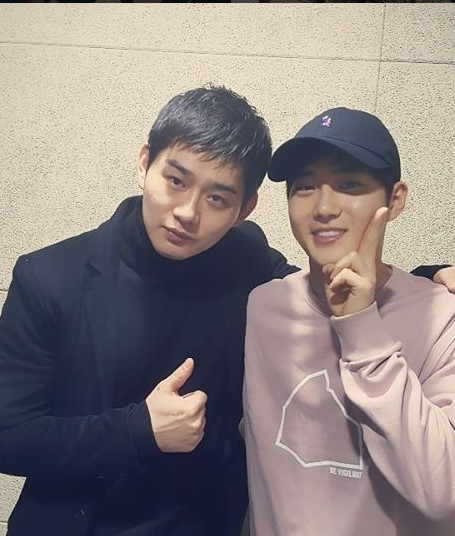 사진 속 장진영은 엄치를 치켜세우고 있고 수호는 그의 곁에서 미고 짓고 있다.
