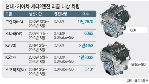 국토교통부는 6일 현대·기아차가 그랜저(HG), 쏘나타(YF), K5(TF) 등 5개 차종 17만1348대에 대해 리콜을 한다고 밝혔다. 리콜 대상은 2013년 8월 이전에 생산된 ‘세타2’ 엔진 장착 차량으로 그랜저 11만2670대, 소나타 6092대, K7 3만4153대, K5 1만3032대, 스포티지 5401대다. 세타2 2.4GDi·2.0터보 GDi 엔진을 장착한 이들 차량은 ‘주행 중 시동 꺼짐 가능성’이 발견됐다. 경기 화성 엔진공장 세타2 GDi엔진 생산 공정에서 발생한 크랭크 샤프트 오일홀 가공 시 청정도 문제로 일부 차량에서 이 같은 문제가 발생했다.