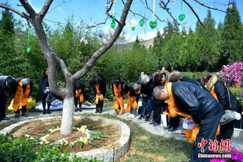 | 장례문화에 대한 비판이 일면서 중국에서는 최근 간소화, 친환경 장례문화가 적극적으로 권장되고 있다. 사진은 지난 3월 26일 허베이(河北)성 핑산(平山)현 구중산링위안(古中山陵園) 생태 묘원에서 20가족이 함께 단체 화장(花葬) 및 수장(樹葬) 의식을 거행하는 공익 장례식. 제공:인민망 |