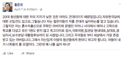 홍 후보는 지난 7일 반말로 “야들아 내가 너희들의 롤모델이다. 그런데 왜 나를 싫어하냐?”며 ‘내가 청년들의 롤모델’이라는 주장을 담은 게시글을 남겼다가 빈축만 샀다.