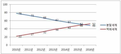 액체세제는 본격적으로 시장을 형성한 2010년부터 작년까지 해마다 4~5% 포인트씩 증가 추세를 보이다 지난해 액체세제가 4%포인트 앞선 점유율로 처음으로 분말세제를 추월했다.