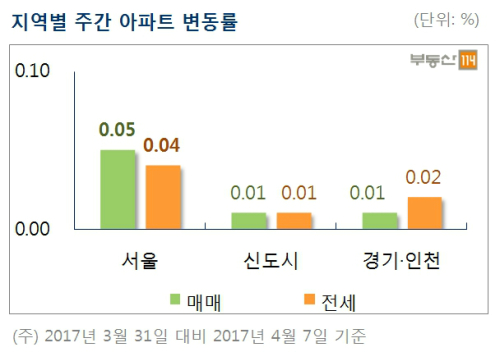 부동산114는 4월 첫째주 서울 아파트 매매가격이 전주대비 0.05% 올랐다고 9일 밝혔다. 이로써 지난 1월 중순 이후 12주 연속 상승세를 이어가게 됐다.