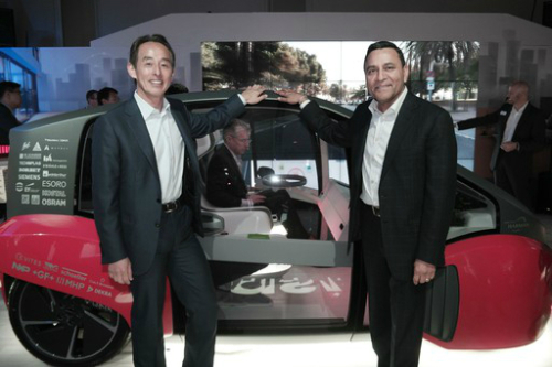 | 지난 1월 미국 라스베이거스 하드락 호텔에 마련된 하만 전시장에서 삼성전자 손영권 사장(왼쪽)과 디네쉬 팔리윌 하만 최고경영자(CEO)가 자율주행용 사용자경험을 구현한 콘셉트 차량인 ‘오아시스’를 선보이고 있다. 삼성전자 제공 |