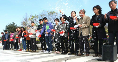 | 10일 오전 경남 창원시 의창구 경남도청 앞에서 `적폐청산과 민주사회건설 경남운동본부`가 홍준표 자유한국당 대선후보의 정계은퇴를 요구하는 기자회견을 한 뒤 소금을 뿌리는 퍼포먼스를 하고 있다. 연합 |