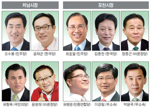 포천 지역에는 더불어민주당 최호열, 자유한국당 김종천, 바른정당 정종근, 민중연합당 유병권, 무소속 이강림·박윤국 후보 등 6명이 출마했다. 이들 후보는 지역을 돌며 지명도를 끌어올리는 데 몰두하고 있다. 당 소속 후보는 중앙당 소속 국회의원과 경기도당 위원장 등을 앞 세웠고, 무소속 후보들은 발품으로 맞서고 있다.