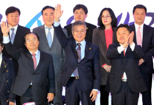 | 文, 부산 선대위 출범식 더불어민주당 문재인 후보(앞줄 가운데)가 11일 오후 부산 벡스코 컨벤션홀에서 열린 국민주권 부산 선대위 출범식 및 부산 비전 선포식에서 참석자들에게 손을 들어 인사하고 있다. 부산=연합뉴스 |