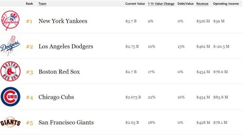 3위에는 보스턴 레드삭스(27억 달러)가 자리했고, 4위는 시카고 컵스(26억 7500만 달러), 5위는 샌프란시스코 자이언츠(26억 5000만 달러)가 이름을 올렸다. 최하위인 30위는 30위는 탬파베이 레이스로(8억 2500만 달러)에 그쳤다. ESPN은 “구단 가치 상위 5개 팀에 최근 8년 가운데 6번이나 월드시리즈 우승을 차지했다”고 전했다.