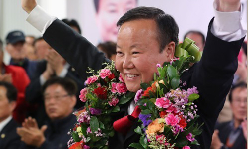 | 자유한국당 김재원 후보가 12일 경북 상주·의성·군위·청송 국회의원 재선거에서 당선이 확실시 되자 상주시 서문동 자신의 선거 사무소에서 두 손을 번쩍 들어 기뻐하고 있다. 상주=연합뉴스 |
