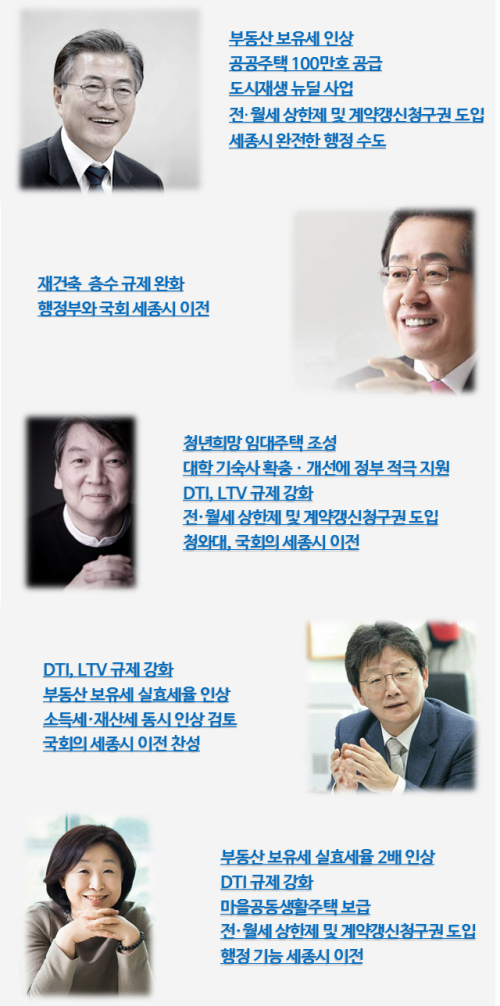 먼저 문재인 더불어민주당 후보는 부동산 보유세 인상과 공공주택 100만호 공급, 전·월세상한제 및 계약갱신청구권을 도입해야 한다는 입장이다.