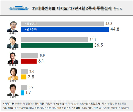 문재인 더불어민주당 후보가 대선 지지도 여론조사에서 44.8%의 지지율로 선두를 지켰다. 여론조사 전문업체 리얼미터가 MBN·매일경제 의뢰로 실시한 4월 2주차 차기 대선주자 지지도 조사에서 문재인 후보가 지난주 대비 2.6%p 상승한 44.8%를 기록했다.