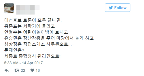 이 트윗을 남긴 이는 문 후보 지지자인 모양이다. 문 후보를 서울 세종로 종합청사 관리인으로 보내자고 주장했다. 대선에서 집권하면 대통령 집무실을 정부종합청사로 옮기고 출·퇴근하는 대통령이 되겠다는 문 후보의 약속을 염두에 둔 듯하다.