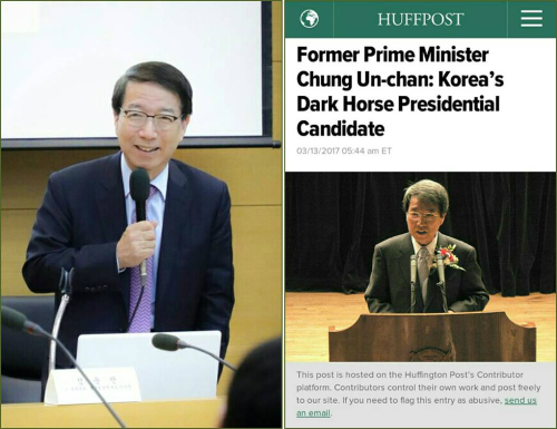 미국 허밍턴 포스트(The Huffington Post)의 지난달 기사에 “한국 대선의 다크호스, 정운찬 전 국무총리(Former Prime Minister Chung Un-chan: Korea’s Dark Horse Presidential Candidate)”라는 제목이 게재됐다.