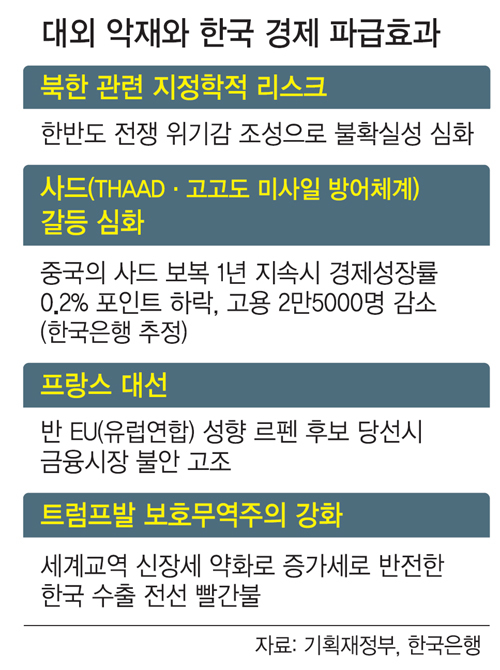 한국 경제 앞에 놓인 또 다른 대외 악재도 적잖다. 당장 16일 오전 북한은 탄도미사일 발사를 강행하면서 지정학적 위험이 고조되고 있다. 사드(THAAD·고고도미사일방어체계) 갈등에 따른 중국의 무역제한 조치 장기화도 부담이다. 한국은행은 중국의 사드 보복이 1년간 진행되면 올해 우리나라 경제성장률을 0.2%포인트 떨어뜨리고 고용을 2만5000명가량 줄일 것으로 추정했다. 내달 7일 결선투표가 치러지는 프랑스 대선에서 반유럽연합(EU) 정책 공약을 내세우는 후보들이 당선되면 세계 금융시장이 크게 요동칠 것으로 관측된다.