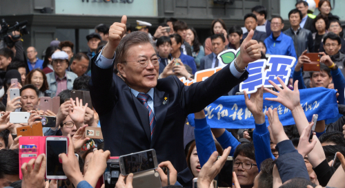 | 더불어민주당 문재인 대선후보가 20일 오전 강원도 춘천시 중앙로에서 열린 유세 현장에서 지지자들에게 손을 들어 인사하고 있다. 춘천=이제원기자 |