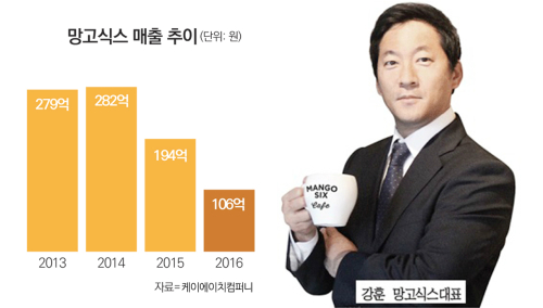 21일 금융감독원 전자공시스템에 따르면 망고식스를 운영하는 케이에이치컴퍼니는 지난해 106억원의 매출을 기록했다. 직전년도 194억원 대비 45.4% 하락했다. 한창 잘나가던 2013년과 2014년 각각 279억원, 2014년 282억원에 견줘 60% 넘게 매출이 급감했다. 케이에이치컴퍼니는 법인 설립 이듬해인 2011년 3월부터 본격적인 가맹사업에 나섰다.