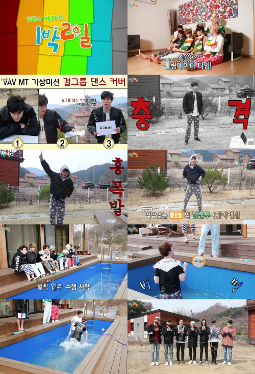 공개된 영상 속 VAV는 멤버 간의 진심을 알아보는 롤링 페이퍼 게임부터 기상 미션을 통한 걸그룹 랜덤 댄스 릴레이 게임 그리고 마지막으로 최하위 점수를 기록한 세 명의 지하 냉수 입수 벌칙까지 웃음이 끊이지 않는 장면들이 쉴 틈 없이 이어져 시청자들의 이목을 사로잡았다.