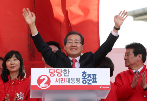 | 자유한국당 홍준표 대선후보가 22일 오후 서울역 광장에서 열린 집중유세에서 지지를 호소하고 있다. 연합 |
