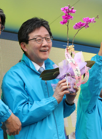 | 바른정당 유승민 대선후보가 22일 오후 경북 경산시 정평동 중앙종합시장 앞에서 유세하던 중 한 지지자가 건넨 꽃을 들고 있다. 연합 |