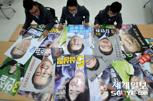 | 공식 선거운동 둘째 날인 지난 18일 서울 종로구 혜화동 서울특별시 선거관리위원회에서 관계자들이 선관위에 도착한 대선후보별 벽보를 점검하고 있다 |