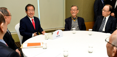 | 자유한국당 홍준표 대선후보가 23일 오전 서울 여의도 메리어트호텔에서 국가 원로를 예방한 자리에서 인사말을 하고 있다. 이 자리에는 김재창 전 한미연합사 부사령관, 최광 전 보건복지부 장관, 이영작 박사, 노재봉 전 총리, 정기승 전 대법관, 정진태 전 육군대장 등이 참석했다. 이제원 기자 |
