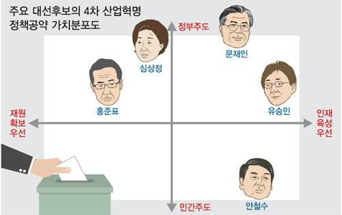 모든 후보가 공통적으로 중소·벤처기업 육성을 위해 중소기업청을 장관급 부처로 격상시키는 방안을 내놓았다. 4차 산업혁명을 정부 주도로 할 것인지 민간 주도로 이끌어나갈 것인지에 대한 의견은 갈리는 추세다.