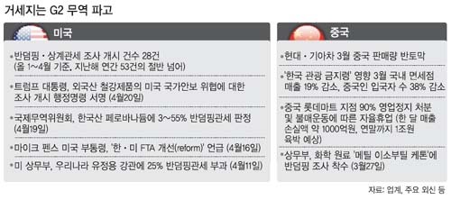 24일 한국무역협회 등에 따르면 올 들어 4개월간 미국의 반덤핑·상계관세 조사 건수는 이미 지난해(53건)의 절반을 넘어섰고, 관련법을 강화한 징벌적 수준의 ‘관세 폭탄’까지 매기고 있다. 지난 20일(현지시간)에는 도널드 트럼프 대통령이 외국산 철강제품의 미국 국가안보 위협에 대한 조사를 개시하는 행정명령에 서명했다. 더 심각한 문제는 미국 정부의 정보 제공 요구에 성실히 응하지 않은 기업에 고율 관세를 부과할 수 있는 ‘불리한 가용정보’(AFA) 규정이다. 미국 상무부는 2015년 이후 외국 기업을 상대로 조사한 247건 중 60건에 대해 AFA를 적용했다. 우리나라를 포함한 시장경제 국가가 대상인 41건의 평균 관세율은 52.28%에 달했다.