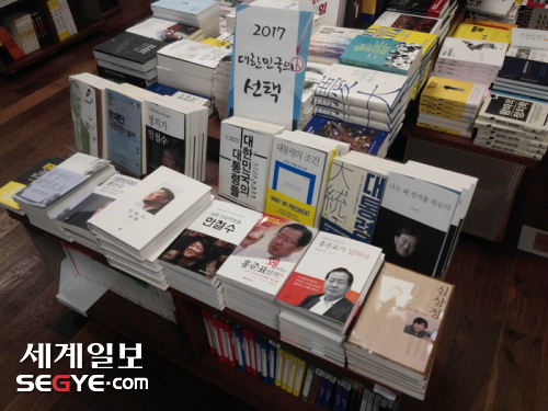 | 서울 교보문고 광화문점 정치 코너에 진열된 대선 후보 관련 도서들. |