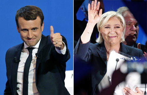 | 지난 23일 치러진 프랑스 대선 1차 투표에서 각각 1·2위로 결선 진출을 확정한 ‘앙 마르슈’의 에마뉘엘 마크롱 후보(왼쪽)와 국민전선의 마린 르펜 후보가 환호하는 지지자들에게 답례하고 있다. 파리·에넹 보몽=AP연합뉴스 |