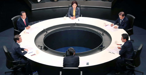 과거 한솥밥 후보와 마주앉아 입력 : 2017-04-25 23:40:07 수정 : 2017-04-25 23:40:06 구글 네이버 유튜브 25일 오후 경기도 고양시 빛마루 방송지원센터에서 JTBC·중앙일보·한국정치학회 주최로 열린 2017 제19대 대통령 선거 후보 초청 토론회에서 5개 정당 대선 후보들이 원탁에 둘러앉아 토론을 벌이고 있다. 고양=국회사진기자단 Copyright ⓒ 세계일보. 무단 전재 및 재배포 금지 세계일보 박영준